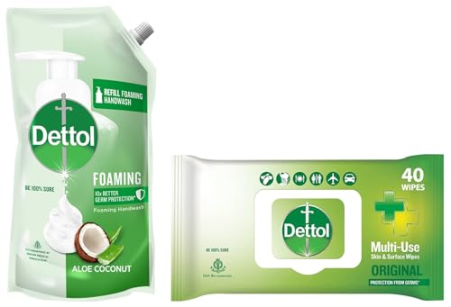 Dettol Foaming Handwash Refill - Aloe Coconut 700ml | Rich Foam | Moisturizing Hand Wash | Soft on HandsBe sure to protect your skin from germs and bacteria. Dettol foaming handwash is a moisture-rich foam that removes dirt and germs while being gentle on skin. This hand wash provides soft and rich lather leaving behind clean hands and mild aloe coconut fragrance. Dettol handwash is dermatologically tested. Dettol handwash are free from parabens/ TCC and are ph balanced.Dettol Germ Protection Wet Wipes for Skin & Surfaces Original - 40 Count|| Moisture-Lock LidDettol's Disinfecting Skin & Surface Wipes are Safe on Skin Ideal to Clean Multiple Surfaces Easy to carry with a resealable Moisture-lock lid. Dettol disinfecting wipes are practical for everyday use on furniture taps sinks door knobs kitchen bathroom surfaces floor cleaning childrenâs surfaces and places that are germ hotspots. It can be used on most hard non-porous surfaces including Finished Wood Sealed Marble Stainless Steel Laminated Floors Glass and Plastic.
