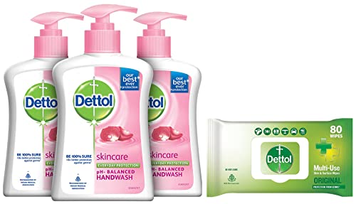 Dettol Liquid Handwash Dispenser Bottle Pump -Â Skincare Moisturizing Hand Wash (Pack of 3 - 200 ml each) | Antibacterial Formula | 10x Better Germ ProtectionBe 100% sure to protect your skin from 100 illness-causing germs and bacteria. Use Dettol's Skincare Germ Protection Handwash Liquid Soap pH balanced formula every day and keep your hands hygienically clean and refreshed. This hand wash provides soft and rich lather leaving behind clean hands and fragrance. The trusted germ-protection modus operandi acts like a barrier between your hands and a wide range of unseen germs. The soap-free formula with glycerin makes sure to keep your skin moisturised while the plant derived cleansers help ensure thorough cleaning. Dettol handwash also contains more than 85% naturally derived ingredients with no TCC & Triclosan giving another healthy reason for hand washing whenever in need. Wash hands properly with Dettol and help keep your family healthy! Safety Information: Keep out of reach of children unless under adult supervision. Avoid direct contact with eyes. For external use. In case of contact with eyes rinse immediately with plenty of water. If persistent irritation occurs seek medical attention.Dettol Disinfectant Sanitizer Wet Wipes for Skin & Surfaces Original â 80 Count| Moisture-Lock Lid | Safe on Skin | Ideal to Clean SurfacesDettol's Disinfecting Skin & Surface Wipes are Safe on Skin Ideal to Clean Multiple Surfaces Easy to carry with a resealable Moisture-lock lid. Dettol disinfecting wipes are practical for everyday use on furniture taps sinks door knobs kitchen bathroom surfaces floor cleaning childrenâs surfaces and places that are germ hotspots. It can be used on most hard non-porous surfaces including Finished Wood Sealed Marble Stainless Steel Laminated Floors Glass and Plastic.