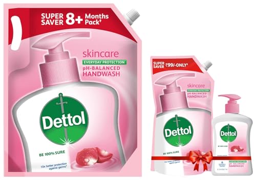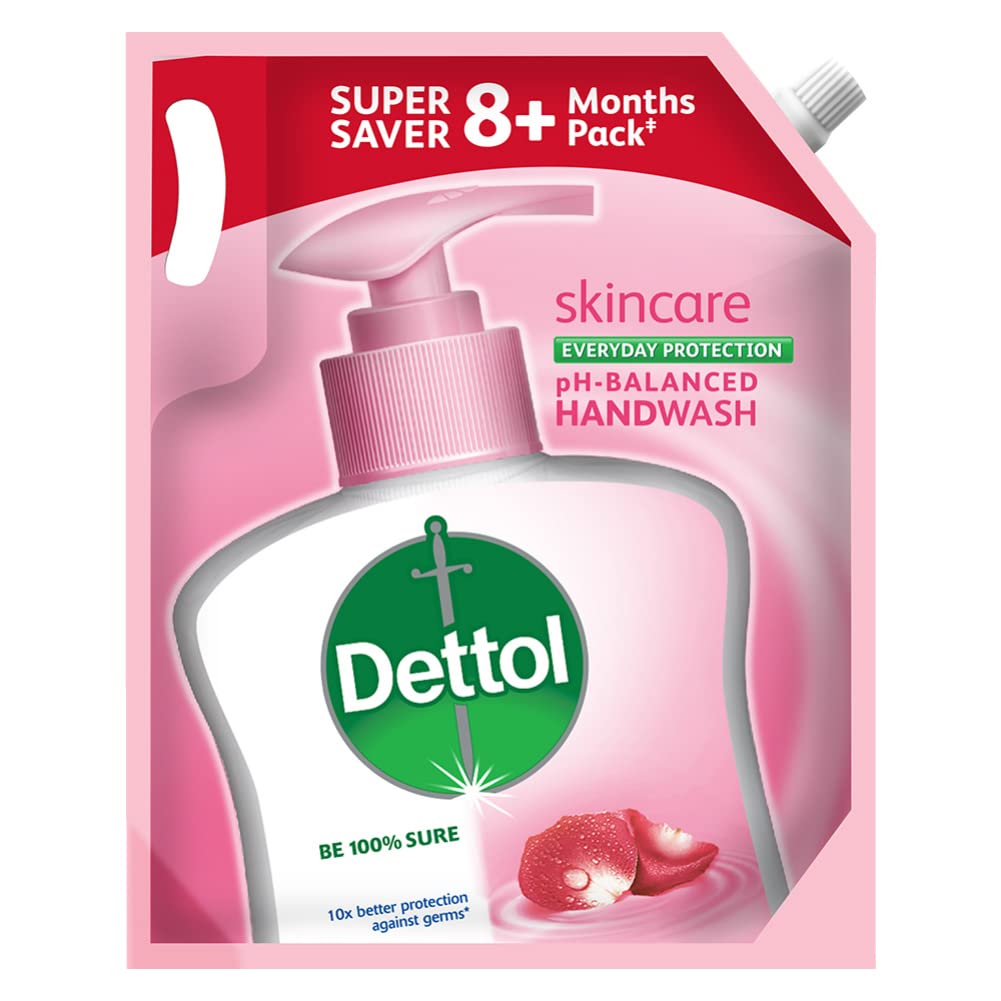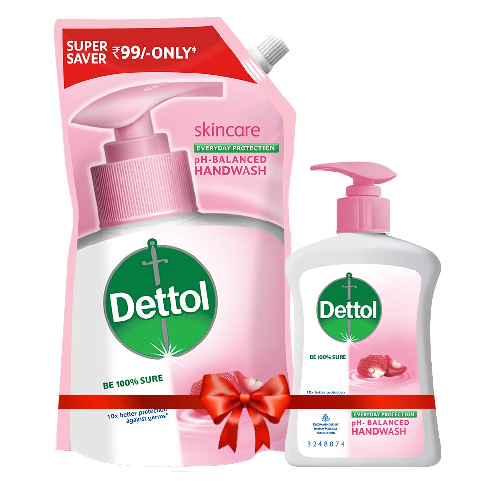 Dettol Liquid Handwash Refill â Skincare Hand Wash- 675ml and Dettol Liquid Handwash Pump 200ml | pH Balanced | 10x Better Germ ProtectionBe 100% sure to protect your skin from 100 illness-causing germs and bacteria. Use Dettol's Skincare Germ Protection Handwash Liquid Soap pH balanced formula every day and keep your hands hygienically clean and refreshed. This hand wash provides soft and rich lather leaving behind clean hands and fragrance. The trusted germ-protection modus operandi acts like a barrier between your hands and a wide range of unseen germs. The soap-free formula with glycerin makes sure to keep your skin moisturised while the plant derived cleansers help ensure thorough cleaning. Dettol handwash also contains more than 85% naturally derived ingredients with no TCC & Triclosan giving another healthy reason for hand washing whenever in need. Wash hands properly with Dettol and help keep your family healthy! Safety Information: Keep out of reach of children unless under adult supervision. Avoid direct contact with eyes. For external use. In case of contact with eyes rinse immediately with plenty of water. If persistent irritation occurs seek medical attention.Dettol Liquid Handwash Refill â Skincare Hand Wash- 1500ml | pH Balanced | 10x Better Germ ProtectionBe 100% sure to protect your skin from 100 illness-causing germs and bacteria. Use Dettol's Skincare Germ Protection Handwash Liquid Soap pH balanced formula every day and keep your hands hygienically clean and refreshed. This hand wash provides soft and rich lather leaving behind clean hands and fragrance. The trusted germ-protection modus operandi acts like a barrier between your hands and a wide range of unseen germs. The soap-free formula with glycerin makes sure to keep your skin moisturised while the plant derived cleansers help ensure thorough cleaning. Dettol handwash also contains more than 85% naturally derived ingredients with no TCC & Triclosan giving another healthy reason for hand washing whenever in need. Wash hands properly with Dettol and help keep your family healthy! Safety Information: Keep out of reach of children unless under adult supervision. Avoid direct contact with eyes. For external use. In case of contact with eyes rinse immediately with plenty of water. If persistent irritation occurs seek medical attention.