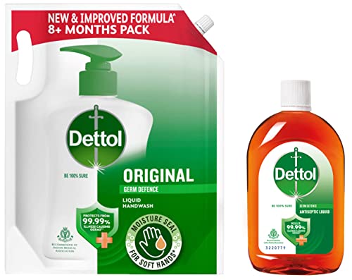 Dettol Liquid Handwash Refill - Original Germ Protection Hand Wash- 1500ml | Antibacterial Formula | 10x Better Germ ProtectionBe 100% sure to protect your skin from 100 illness-causing germs and bacteria. Use Dettol's Original Germ Protection Handwash Liquid Soap pH balanced formula every day and keep your hands hygienically clean and refreshed. This hand wash provides soft and rich lather leaving behind clean hands and mild pine fragrance. The trusted germ-protection modus operandi acts like a barrier between your hands and a wide range of unseen germs. The soap-free formula with glycerin makes sure to keep your skin moisturised while the plant derived cleansers help ensure thorough cleaning. Dettol handwash also contains more than 85% naturally derived ingredients with no TCC & Triclosan giving another healthy reason for hand washing whenever in need. Wash hands properly with Dettol and help keep your family healthy! Safety Information: Keep out of reach of children unless under adult supervision. Avoid direct contact with eyes. For external use. In case of contact with eyes rinse immediately with plenty of water. If persistent irritation occurs seek medical attention.Dettol Antiseptic Liquid for First Aid Surface Disinfection and Personal Hygiene 250mlDettol Antiseptic Liquid protects you and your family from 100 illness causing germs. It comes in a fresh pine fragrance. The topical antiseptic liquid sanitizes your home and helps maintain your personal hygiene. The Dettol first aid antiseptic liquid can be used to protect against infection from cuts and scratches disinfect toys and sanitize baby wear leaving everything clean and fresh. It can also be used as a household disinfectant and cleaner on surfaces or in laundry cleaning to kill germs. This liquid antiseptic is recommended by Indian Medical Association and can be kept in your emergency first aid kit. USAGE: Recommended dilutions to protect your family from germs: Bathing â 5ml to a bucket of water (10 litres); First Aid- 15ml to 300ml of water; Shaving Antiseptic Liquid- 15ml to 300ml of water; Nappy Wash â 12.5ml to 500ml of wate