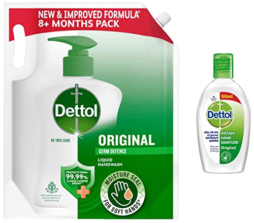Dettol Liquid Handwash Refill - Original Germ Protection Hand Wash- 1500ml | Antibacterial Formula | 10x Better Germ ProtectionBe 100% sure to protect your skin from 100 illness-causing germs and bacteria. Use Dettol's Original Germ Protection Handwash Liquid Soap pH balanced formula every day and keep your hands hygienically clean and refreshed. This hand wash provides soft and rich lather leaving behind clean hands and mild pine fragrance. The trusted germ-protection modus operandi acts like a barrier between your hands and a wide range of unseen germs. The soap-free formula with glycerin makes sure to keep your skin moisturised while the plant derived cleansers help ensure thorough cleaning. Dettol handwash also contains more than 85% naturally derived ingredients with no TCC & Triclosan giving another healthy reason for hand washing whenever in need. Wash hands properly with Dettol and help keep your family healthy! Safety Information: Keep out of reach of children unless under adult supervision. Avoid direct contact with eyes. For external use. In case of contact with eyes rinse immediately with plenty of water. If persistent irritation occurs seek medical attention.Dettol Original Germ Protection Alcohol Based Hand Sanitizer 50mlWith infections leading to diseases on the rise it is our hands that transfer most of the germs by touching various viruses and microbes daily though unintentionally. Washing your hands with soap and water is the best way to reduce the number of microbes on them. However there can be situations where soap and/ or water are not available. In this situation where nothing else really helps Dettol Hand Sanitizers can give you that protection and safety to ensure upto 99.99% Germ Protection. Simply apply a few drops of the disinfectant gel on your hand and rub them thoroughly and voila! You are protected! Your Trusted Dettol offers a new and improved Dettol Hand Sanitizer that is rinse free and non-sticky. It is specially formulated to protect you from 100 illness causing germs. With an easy application drop bottle you can protect yourself & your family from a wide range of illness causing germs anytime anywhere without soap or water. The great thing with the new and improved hand sanitizers by Dettol is that it comes in exciting two variants - floral and spring fresh. So now apart from being clean and fresh you also have superb smelling hands. Keeping germs at bay with Dettolâs on-the-go instant hand sanitizer packs is easy. It is in addition enriched with Moisturizers that doesnât let your hands dry up and leave them 99.9 percent germ-free. These sanitizer bottles are convenient to carry and can be placed anywhere from your pocket purse or bag for on-the-go convenience.