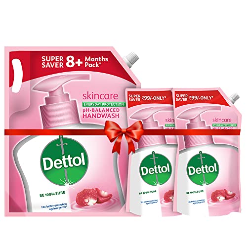 Dettol Liquid Handwash Refill - Skincare Moisturizing Hand Wash 1500 ml (Price offer) | Antibacterial Formula | 10x Better Germ ProtectionBe sure to protect your skin from 100 illness-causing germs and bacteria. Use Dettol's Skincare Germ Protection Handwash Liquid Soap pH balanced formula every day and keep your hands hygienically clean and refreshed. This hand wash provides soft and rich lather leaving behind clean hands and fragrance. The trusted germ-protection modus operandi acts like a barrier between your hands and a wide range of unseen germs. The soap-free formula with glycerin makes sure to keep your skin moisturised while the plant derived cleansers help ensure thorough cleaning. Dettol handwash also contains more than 85% naturally derived ingredients with no TCC & Triclosan giving another healthy reason for hand washing whenever in need. Wash hands properly with Dettol and help keep your family healthy! Safety Information: Keep out of reach of children unless under adult supervision. Avoid direct contact with eyes. For external use. In case of contact with eyes rinse immediately with plenty of water. If persistent irritation occurs seek medical attention.Dettol Germ Protection Handwash Refill - 750 ml (Skincare Pack of 2)Be sure to protect your skin from 100 illness-causing germs and bacteria. Use Dettol's Skincare Germ Protection Handwash Liquid Soap pH balanced formula every day and keep your hands hygienically clean and refreshed. This hand wash provides soft and rich lather leaving behind clean hands and fragrance. The trusted germ-protection modus operandi acts like a barrier between your hands and a wide range of unseen germs. The soap-free formula with glycerin makes sure to keep your skin moisturised while the plant derived cleansers help ensure thorough cleaning. Dettol handwash also contains more than 85% naturally derived ingredients with no TCC & Triclosan giving another healthy reason for hand washing whenever in need. Wash hands properly with Dettol and help keep your family healthy! Safety Information: Keep out of reach of children unless under adult supervision. Avoid direct contact with eyes. For external use. In case of contact with eyes rinse immediately with plenty of water. If persistent irritation occurs seek medical attention.