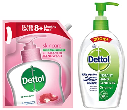 Dettol Liquid Handwash Refill - Skincare Moisturizing Hand Wash 1500 ml (Price offer) | Antibacterial Formula | 10x Better Germ ProtectionBe 100% sure to protect your skin from 100 illness-causing germs and bacteria. Use Dettol's Skincare Germ Protection Handwash Liquid Soap pH balanced formula every day and keep your hands hygienically clean and refreshed. This hand wash provides soft and rich lather leaving behind clean hands and fragrance. The trusted germ-protection modus operandi acts like a barrier between your hands and a wide range of unseen germs. The soap-free formula with glycerin makes sure to keep your skin moisturised while the plant derived cleansers help ensure thorough cleaning. Dettol handwash also contains more than 85% naturally derived ingredients with no TCC & Triclosan giving another healthy reason for hand washing whenever in need. Wash hands properly with Dettol and help keep your family healthy! Safety Information: Keep out of reach of children unless under adult supervision. Avoid direct contact with eyes. For external use. In case of contact with eyes rinse immediately with plenty of water. If persistent irritation occurs seek medical attention.Dettol Original Germ Protection Alcohol based Hand Sanitizer Pump 200mlYour Trusted Dettol offers a a new and improved Dettol Hand Sanitizer. It is specially formulated to protect you from 100 illness causing germs. Protect yourself and your family from a wide range of illness causing germs anytime anywhere without soap or water. You can also protect your family by using the following products: Dettol Wipes: Protects from a wide range of germs anytime anywhere. Dettol Bar Soap: Provides 100% better protection vs ordinary soaps. Dettol Liquid Handwash: protects you from 100 illness causing germs. Usage : Squeeze a thumbnail size amount onto your palm then briskly rub your hands and fingers together until dry.