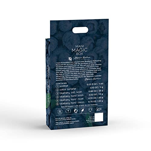Indulge in this refreshing regime and get healthy glowing and rejuvenated skin. This no-nasty 6 steps Blueberry Manicure & Pedicure Kit is free of harsh chemicals parabens alcohol artificial fragrance and colour. It is enriched with the goodness of Neroli Geranium and Peppermint oil. The salt soak deep cleanses the impurities while the combination of Blueberry Fruit Extract and sugar in the scrub eï¬ortlessly exfoliates dead skin cells. The Blueberry pack renders a brighter look with the help of kaolin clay and Jojoba oil. Indulge in this refreshing regime and enjoy a healthy glow with invigorating all-natural ingredients like Beeswax Lavender essential oil and Shea butter.