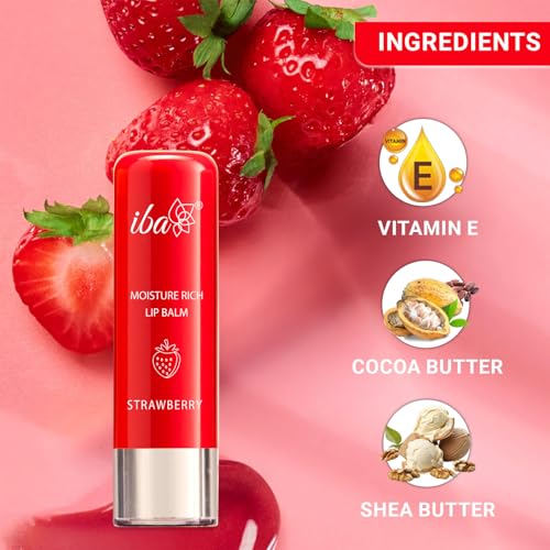 Iba Pure Lips Moisture Rich Lip Balm - Strawberry 4.5 g | For Pigmented Dry Damaged & Chapped Lips | Enriched with Cocoa Butter Shea Butter | Glossy Finish | 100% Natural | Halal Certified & Vegan