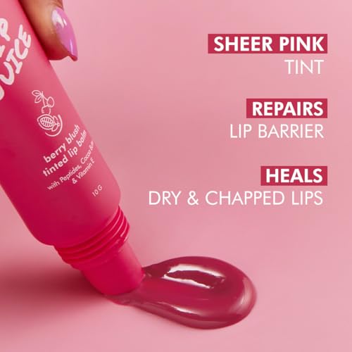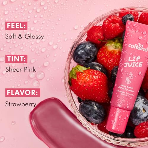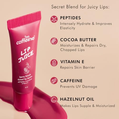 mCaffeine Lip Juice Tinted Lip Balm - Berry Blush | 24 hrs Moisturization | With Peptides, Cocoa Butter & Vitamin E | Heals Dry & Chapped Lips | Lip Balm For Women | Sheer Pink Tint - 10g