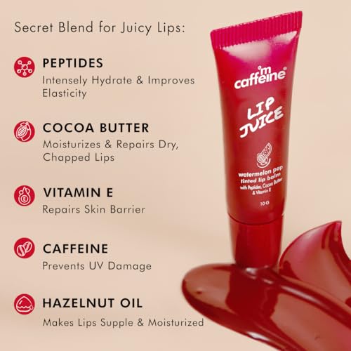 mCaffeine Lip Juice Tinted Lip Balm - Watermelon POP | 24 hrs Moisturization | With Peptides, Cocoa Butter & Vitamin E | Heals Dry & Chapped Lips | Lip Balm For Women | Sheer Red Tint - 10g