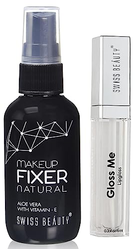 Swiss Beauty Long lasting Misty Finish Professional Makeup Fixer Spray for Face makeup | With Aloe Vera and Vitamin- E | Light weight quick dry makeup Setting spray |70 ML|Makeup fixer used either before or after makeup is to set your makeup so that it can stay longer and not be wiped off with touch of hands or run off with perspiration. Spray from a distance and let it dry before applying makeup or to set makeup or to set makeup spray after applying makeup.Swiss Beauty Metallic Gloss Me Lip Gloss | LightweightNon Sticky and Hydrating Lip Gloss| White 6MlIf you want to know how these glosses feel on the lips the clue is in the name. But while its softer than butter its not sticky or gloopy in the bargain. The lightweight formula allows you to wear it alone or on top of a matte lipstick to make it feel less drying. Plus the colossal shade range will make any beauty addict feel like a kid in a cosmetic candy shop.