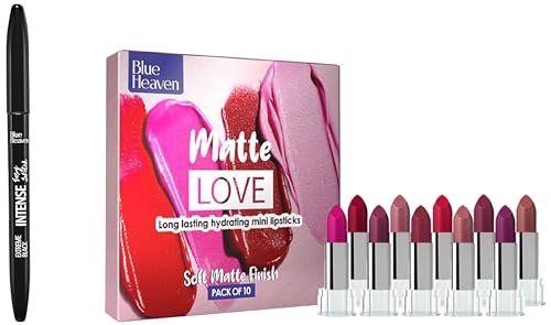 Blue Heaven Matte Love Mini Lipsticks Pack of 10 | Hydrating & Moisturizing Mini Roll on Lipsticks 13gm"Blue Heaven's Matte Love combo is here with 10 stunning shades that give a grogeous matte finish! There's a shade for every mood!"Blue Heaven Intense Eyeliner Easy Sketch Black 1ml Matte FinishThis new-gen advanced eye writer pen delivers high color precision line around your eyes. Its fine felt tip applicator gives exact color which dries quickly and won't smudge or fade. Its water proof formula stays for longe
