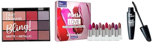 Blue Heaven Matte Love Mini Lipsticks Pack of 10 | Hydrating & Moisturizing Mini Roll on Lipsticks 13gm"Blue Heaven's Matte Love combo is here with 10 stunning shades that give a grogeous matte finish! There's a shade for every mood!"Blue Heaven Lash Twist Mascara Black 12 mlOur volumising mascara creates massive volume without weighing down lashes leaving your eyes with bigger bolder lashes. Our special silicon curling wand gives each lash a twist and lift. Never worry about runny mascara with our anti-clumping waterproof formula that lasts for 12 hours.Blue Heaven 12-In-1 Bling Eyeshadow Subtle Romance (Multicolor) Metallic FinishBlue Heaven Bling Matte and Metallic palette is a 12-IN-1 eyeshadow palette with matte and metallic shades. This palette will add instant glamour to your look and take it from day to night in just a few strokes. The shades are buttery soft and glide on the eyelids creating a smooth non-patchy eyeshadow look. Creating fun young smokey and colourful looks has never been easier - with this must-have palette!