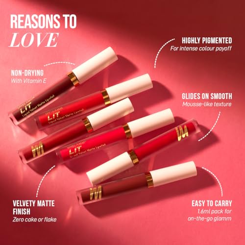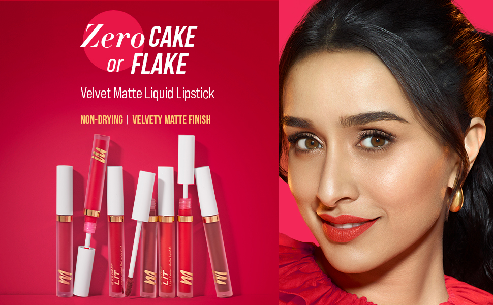 A smooth creamy mousse formula MyGlamm LIT Velvet Matte Liquid Lipstick is poppin with pigment. This true matte lipstick gives one swipe pigmentation for super-saturated payoff. Infused with Vitamin E the moisturising matte glides on the lips for a comfy and cushy feel. MyGlamm LIT Velvet Matte Liquid Lipstick is available in 12 vivid shades in an easy-to-carry pack for velvety lips that do all the talking (and more) - zero cake or flake!