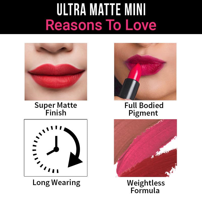 We at Nykaa get inspired by the love we receive for our work. Your love and appreciation inspired us to come up with these mini versions of your favorite Ultra Matte lipsticks. Now 12 of your most loved shades have been added to the Mini family! These super matte lipsticks adorn your lips with a veil of full-bodied colour and a one-stroke matte finish. Its super smooth Jojoba Oil and Vitamin E enriched formula glides on your lips effortlessly and keeps them nourished all day long. Keep your favourite Nykaa Ultra Matte Mini handy while on the go to give your lips an insta pick-me-up.