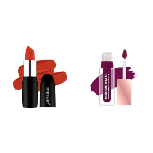 Swiss Beauty Pure Matte Lipstick | Long Lasting Hydrating & Lightweight Lipstick | Orange Red 3.8gm|Swiss Beauty pure matte lipstick gives a matte finish on your lips. Exquisitely smoothing. It's like a colour infused fountain of youth for your lips. Instantly drenches lips in perfect locks it in for endless comfort. Infused with advance skin care ingredients the formula appeared in fine lines and helps lips look fuller.Swiss Beauty Hold Me Matte Liquid Lipstick | 12 Hours Stay | Non-Transfer Lipstick | Waterproof Lipstick with Intense Hydration| Shade - Berrylicious 4.5ml"Introducing ""Hold Me Matte Liquid Lipstick"" by Swiss Beauty the ultimate matte lipstick that's here to hold your lips in a matte-tastic embrace! Get ready to enter a world of lip enchantment where non-transferable magic meets non-drying long-lasting colour payoff. Hold the world in awe with the stay-put power of Hold Me Matte Liquid Lipstick. Its non-transfer and non-drying formula ensures your lip colour stays loyal to you no matter what adventures you embark on. From sipping cocktails to indulging in scrumptious delights this lipstick won't budge giving you the freedom to slay all day! Its liquid texture glides on like a dream hugging your lips with intense pigmentation and the added Apricot Oil keeps your lips moisturised. Let your pout steal the spotlight as you rock a lip look that's both daring and delightful. Say goodbye to touch-up troubles as this long-lasting lip BFF stays put for up to 12 hours keeping you selfie-ready at all times. From dawn till dusk your lip colour remains vibrant and vivacious. So pucker up Hold Me Matte Liquid Lipstick is here to hold you close giving you 30 shade options to express your every mood. Step into the limelight and celebrate your beauty with a lip look that's fierce fabulous and flawlessly matte. It's time to turn heads make memories and rock the world with your irresistibly stunning lips!