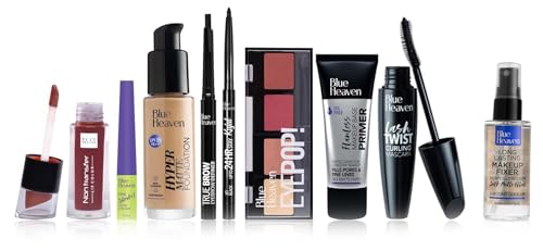 Blue Heaven Festive MakeUp Kit For Women Medium Tone Combo 75gm (Pack of 8)Description - Recreate the dazzling make-up look this festive season with the specially curated all-in-one make-up kit by one of the most loved Indian cosmetic brand. The Blue Heaven all-in-one Festive make-up kit comprises of Flawless Makeup Base Primer Mini Hyper Matte Foundation - Natural shade(suitable for medium complexion) Upto 24hrs Stay Kajal 4x1 Eyepop Eyeshadow â Any shade One Stroke Eyeliner Lash Twist Mascara - Black Lip Mousse Lipcolor â Any shade True Brow eyebrow enhancer â Grey. Whether you are planning a simple-subtle daytime look or looking at mirroring the red carpet-ready glamour the Blue Heaven Festive make-up kit is just perfect to create the stunning look. Its an absolute must have Festive kit to create gorgeous looks for every occasion. And this stunning amazing make-up kit comes in a beautiful make-up box that you would love to flaunt and preserve it forever.Blue Heaven Long Lasting Make-Up Fixer 60mlBlue Heaven Make Up Fixer helps in setting your makeup for a longer stay & making it difficult to wiped off with touch or run off with perspiration. You Would definitely do not want heat and perspiration to take over your makeup right? This makeup setting spray by Blue Heaven ensures that your makeup stays on for long and does not run off even with the slightest amount of perspiration or touch. Features: Ensures that your makeup stays on for long. Soothes & mattifies your skin. Refreshes skin and adds finishing touch to your makeup. Contains the goodness of Aloe Vera Vitamin E and Vitamin B5. Paraben Free . Usage: Use It Before or after putting makeup. Close your eyes hold the bottle 20-24 Cm away from your face & spray. Wait till it dries for best results. To Remove the makeup wash it with soap & water.