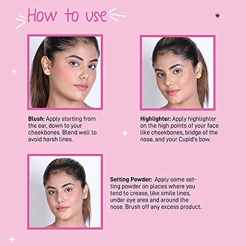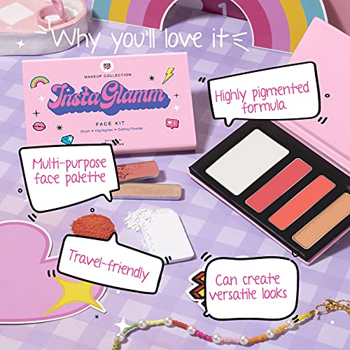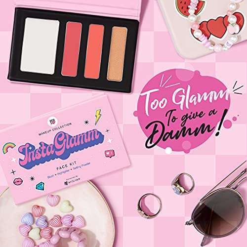 Too glamm to give a damn! The Insta Glamm - Face Makeup Kit features all your handbag essentials in an easy-to-carry mini palette. This phenomenal yet small makeup kit includes 2 peachy-coral blush shades a translucent setting powder and a golden highlighter - in short all you need for stunning selfies and midday touch-ups. Looks like that #VacayGlow is only a few swipes away! Take your Glamm everywhere with this complete face makeup kit. Ditch your clunky blush highlight and setting powder compacts because now you can fit all your glowing essentials in one travel-friendly multi-functional palette. This full face makeup kit is truly an instant solution for touch-ups anywhere anytime. This mini face palette is perfect for beginners as well as professional makeup artists. Want more? All the shades have an intensely pigmented formula and blend like a dream.