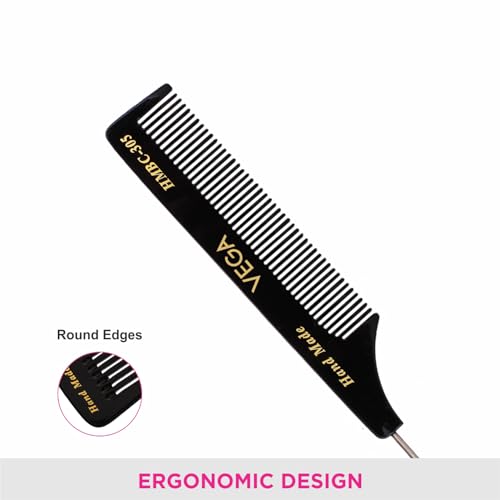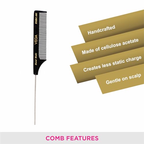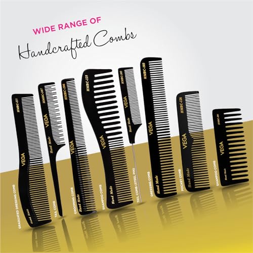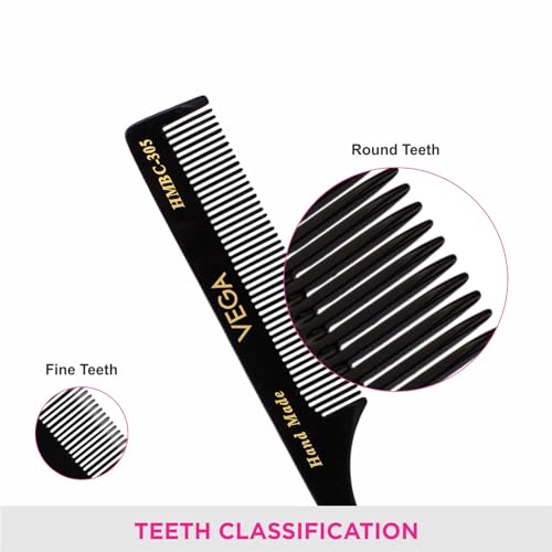 Vega handcrafted black combs are made from cellulose acetate which do not create static charge in hair due to its non-petroleum based material which is derived from natural plants. It has smooth rounded teeth which do not hurt your scalp while combing and helps to reduce hair fall. It is gentle on scalp and ideal for sensitive skin. Perfect for salon professionals useful for grooming and styling hair and adding lustre.
