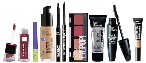 Blue Heaven Festive MakeUp Kit For Women Medium Tone Combo 75gm (Pack of 8)Description - Recreate the dazzling make-up look this festive season with the specially curated all-in-one make-up kit by one of the most loved Indian cosmetic brand. The Blue Heaven all-in-one Festive make-up kit comprises of Flawless Makeup Base Primer Mini Hyper Matte Foundation - Natural shade(suitable for medium complexion) Upto 24hrs Stay Kajal 4x1 Eyepop Eyeshadow â Any shade One Stroke Eyeliner Lash Twist Mascara - Black Lip Mousse Lipcolor â Any shade True Brow eyebrow enhancer â Grey. Whether you are planning a simple-subtle daytime look or looking at mirroring the red carpet-ready glamour the Blue Heaven Festive make-up kit is just perfect to create the stunning look. Its an absolute must have Festive kit to create gorgeous looks for every occasion. And this stunning amazing make-up kit comes in a beautiful make-up box that you would love to flaunt and preserve it forever.Blue Heaven Flawless liquid Concealer 201 Cream 17MLThe all new high coverage concealer in tube with applicator provides flawless look. It has a rich creamy texture and glides on smoothly. A product used to mask The dark circle hide the spots on the skin & gives full coverage. Very handy packing & Available in 6 different shades to suit all type of skin tones. Loaded with moisturiser that keeps skin hydrated all day long. All new formulation with a combination of moisturisers and emollients with aqua.