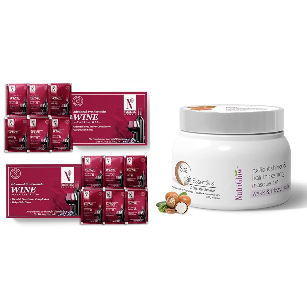 NutriGlowNATURAL'S Advanced Pro Formula Wine Facial Cleanup Kit With Goodness Of Red Grape Extracts 60 gm ( Pack of 2 )Hair Spa Cream With Volumizing & Shine Lock Formula For Weak & Frizzy Hair 300g