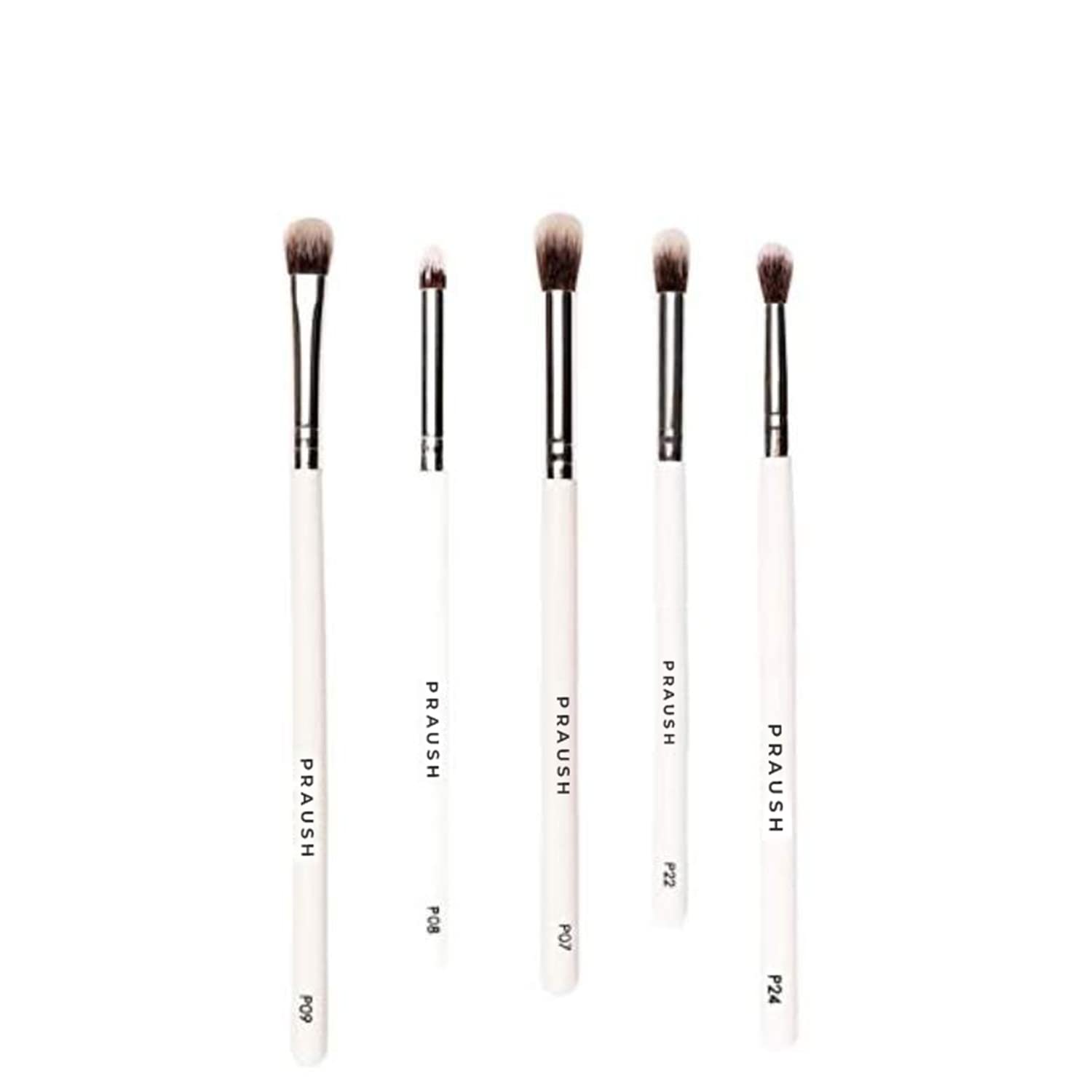 • 5 Pieces Praush Professional Basics Eye Brushes Set: P07: Fluffy eyeshadow blending brush (big) P09: Flat fluffy eyeshadow blending brush P22: Fluffy eyeshadow tapered blending brush (medium) P19: Eyeshadow pencil/smudger smokey brush P18: Flat eyeshadow