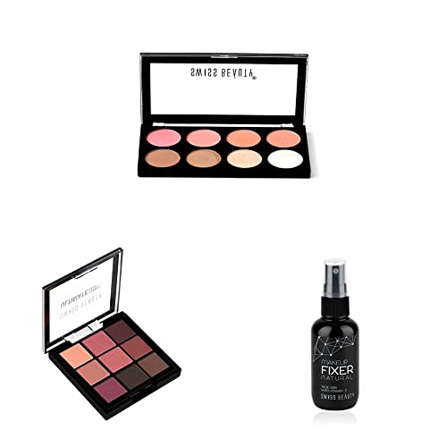 Swiss Beauty Ultra Blush Palette Face Makeup Multicolor-02 16GSwiss Beauty brings you ultra blush palette. A fine way to achieve flawless makeup and look beautiful. Ultra blush palette is the most stunning collection of blushes Shades to complement any makeup artist. - wear these palettes with pride and confidence as it makes you look gorgeous. - soft powder sits on your skin comfortably without giving heavy feel and gives natural finish. - it is a must have in your makeup kit which is easy to apply.Swiss Beauty Ultimate 9 Pigmented colors Eyeshadow Palette| Long wearing and Easily Blendable Eye makeup Palette | Matte Shimmers and Metallic | Multicolor - 06 6gm |Swiss Beauty absolutely new product It is a combination of matte semi-matte and shimmering eyeshadows. Light weight long wear smooth and easy to blend create a new sultry look every day ranging from a nature look to a more sultry evening look these colour tones are highly blendable with an amazing texture that is universally flattering and looks natural on all skin types The palette enables you to choose either a matte or shimmer look for your eyes. These mineral-based eye shadows are so smooth in texture that they are good for contouring eyes and creating multi-dimensional looks.Swiss Beauty Long lasting Misty Finish Professional Makeup Fixer Spray for Face makeup | With Aloe Vera and Vitamin- E | Light weight quick dry makeup Setting spray |70 ML|Makeup fixer used either before or after makeup is to set your makeup so that it can stay longer and not be wiped off with touch of hands or run off with perspiration. Spray from a distance and let it dry before applying makeup or to set makeup or to set makeup spray after applying makeup.