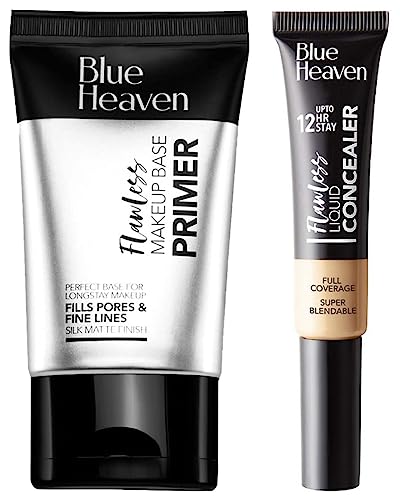 Blue Heaven Flawless Makeup Base Primer 30gA lightweight Formula with silicones and vitamins to soften Soothe and mattify your skin. Makeup Glides on and Stays Fresh For Hours. It Enhances the adherence to Make-Ups while used under Foundation Or Compact Powders. It Can also be used as base for eyeshadows and Blush Ons. Organic - yesBlue Heaven Flawless liquid Concealer 201 Cream 16gmThe all new high coverage concealer in tube with applicator provides flawless look. It has a rich creamy texture and glides on smoothly. A product used to mask The dark circle hide the spots on the skin & gives full coverage. Very handy packing & Available in 6 different shades to suit all type of skin tones. Loaded with moisturiser that keeps skin hydrated all day long. All new formulation with a combination of moisturisers and emollients with aqua.