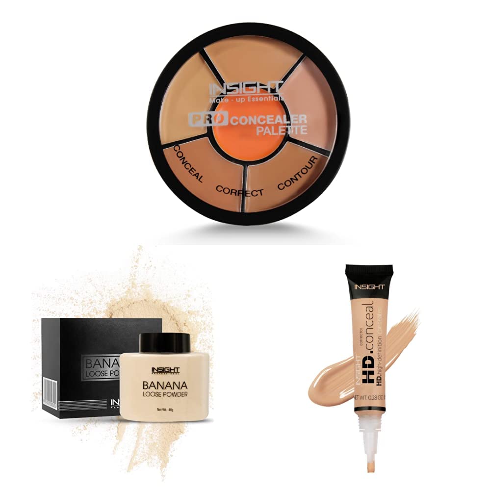 Insight Cosmetics Pro Concealer Palette (Concealer)INSIGHT cosmetics pro Concealer palette features a wheel of 6 shades that can be used to camouflage imperfections conceal dark circles and contour. Its soft creamy texture blends effortlessly to give you a smooth flawless finish. Apart from that it also helps cover discoloration redness and instantly brightens up the skin.INSIGHT COSMETICS COMPACT (Banana)Warm your skin with the new and amazing Insight Cosmetics mattifying Banana Powder. With a hint of color set your foundation and reduce shine whilst correcting redness and pink undertones. With a sieve to prevent clumping and ensure easy application make sure you shake the bottle before use. It is normal for powder to settle whilst shipping and therefore may not look full on arrival. Keep skin fresh clean and oil free for hours with Insight Cosmetics Banana loose powder. This finely milled and lightweight powder glides on smoothly to a soft matte finish. Furthermore this weightless formula locks in makeup ensuring that it stays put for hours without smudging or transferring.Insight HD Concealer Golden Sand-04Insight's pro concealer is a crease resistant waterproof concealer with an opaque creamy yet lightweight texture. This long-wearing concealer blurs our blemishes and camouflages darkness under the eyes including redness to give you a flawless and even-tone complexion. It is a smudge proof and highly pigmented concealer that not just covers imperfections but also keeps oil under control to give you that perfect mattified finish. What's more? It is paraben and cruelty-free.