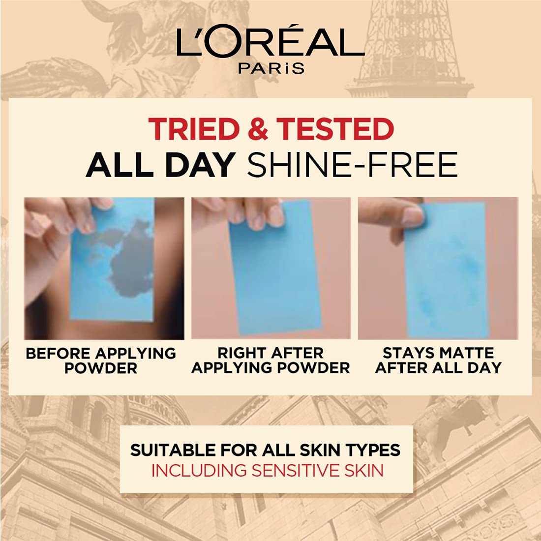 Control oil shine and sebum on your face for up to 24 hours with the L'Oreal Paris Infallible Oil Killer High Coverage Powder that gives a mattifying and no cakey look! This compact powder provides high coverage for a smooth and natural finish and is formulated with SPF 32 and PA +++ for sun protection! The L'Oreal compact is lightweight and powered with micro-pigments to blur pores and blemishes from your skin. Lightweight in texture this face powder for face makeup makes the application much easier by just dabbing it onto the skin with a sponge. Apart from this this is heatproof humidity proof and waterproof compact powder that is made of a breathable formula that helps you to stay comfortable even under a face mask! Feel Infallible and give your skin the best by using this non-comedogenic product! Especially designed compact powder for oily skin & sensitive skin this product also helps to lock in your base makeup for hours and is suitable for all skin types as well. The face powder is now available in 8 shades and there is one suitable for each Indian skin tone! How to apply Infallible Oil Killer Powder flawlessly: 1. Apply the powder with provided sponge in a dabbing motion. 2. The face powder can be used on its own or over liquid foundation for all day matte finish. For best results you can use this compact powder with the L'Oreal Paris Infallible 24H Matte Cover Liquid Foundation to achieve an even matte base and stand out from the rest.