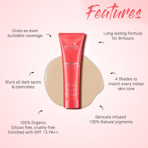 Biotique Natural Makeup Magicare All Day FoundationBiotique Magicare All Day Foundation is skincare-infused. It has vitamins unique moisture lock formula plant and mineral pigments for a flawless finish and even skin tone. The Foundation comes in a variety of shades for every skin type.USPs:Skincare-infusedNourishes your skinClear flawless finishOffers smooth flawless coverageLong-lasting; All day coverageFor Every Skin Tone; Suitable for every skin typeRemoval Tip: Use Bio Almond Makeup Cleanser