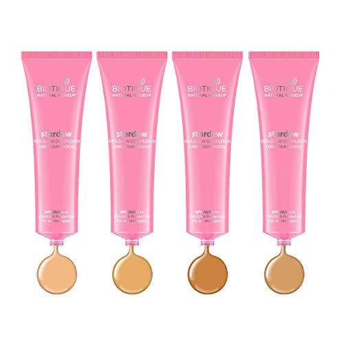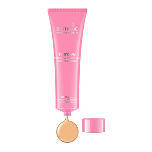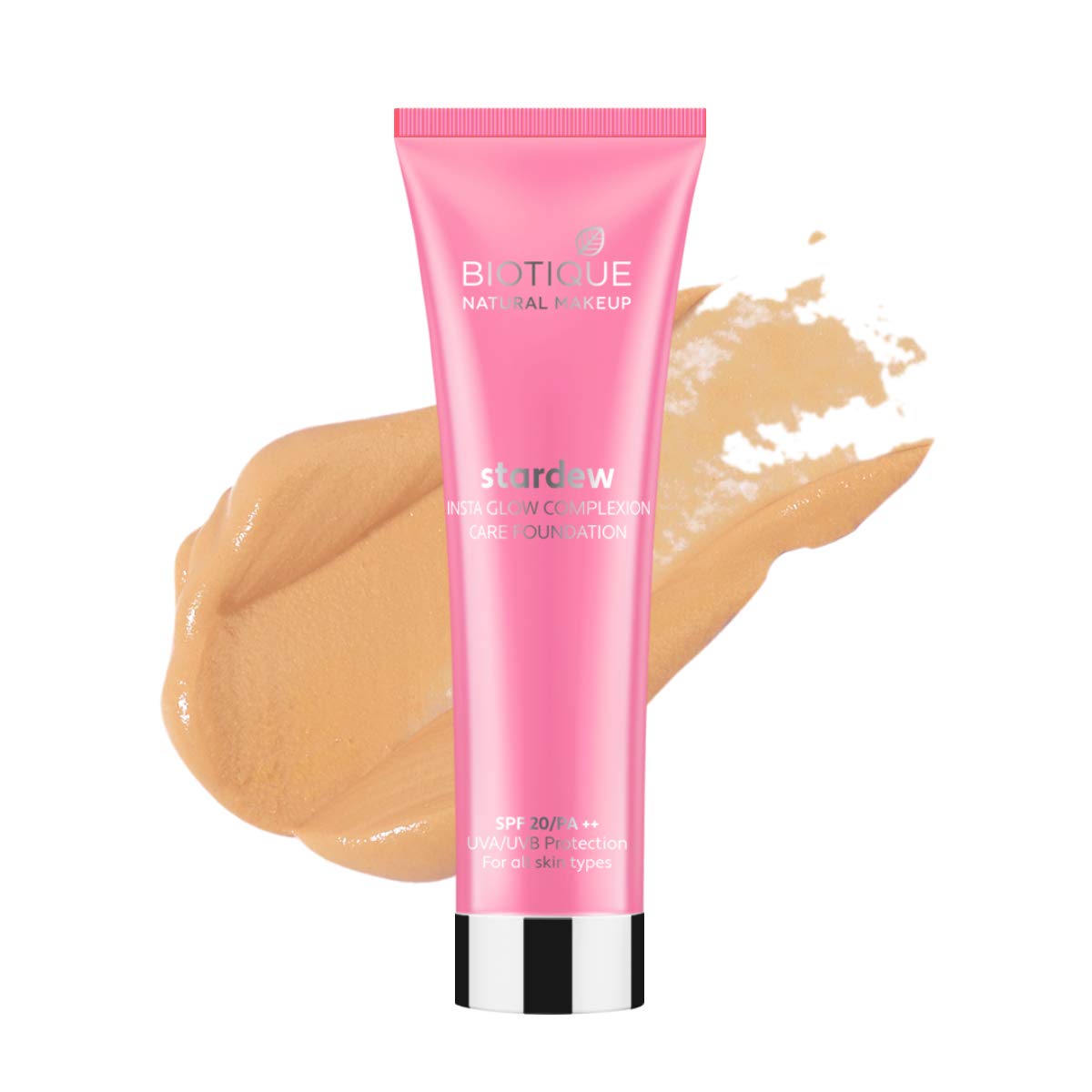 A long wear foundation which stays all day and protects your skin from harmful uv rays. Mineral and colour pigments from plant sources provide: instant glow flawless coverage conceals and gives even skin tone. Biotique stardew insta glow complexion care foundation is available in 4 pigmented shades; vanilla biscuit honey and caramel. Removal tip: use bio almond makeup cleanser.