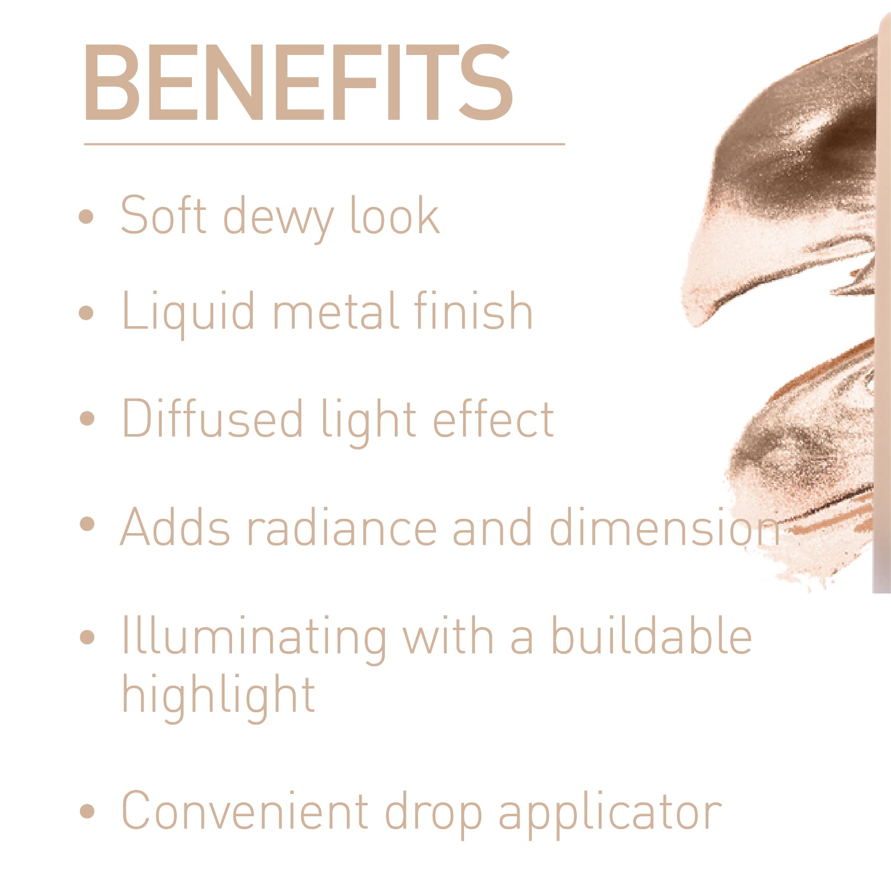 • Metallic Finish: The illuminating liquid offers buildable coverage with soft dewy finish