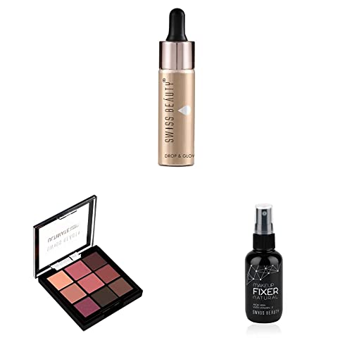 Swiss Beauty Drop & Glow Liquid Highlighter For Face makeup | illuminating Liquid Highlighter with Dewy finish | Shade -Gold 18ml|Get the natural glowing skin with Swiss Beauty drop & glow liquid highlighter. Use them alone on your cheek bones forehead and high point of your face or add a few drops to your favourite liquid foundation primer or skincare product for an all-over glow.Swiss Beauty Ultimate 9 Pigmented colors Eyeshadow Palette| Long wearing and Easily Blendable Eye makeup Palette | Matte Shimmers and Metallic | Multicolor - 06 6gm |Swiss Beauty absolutely new product It is a combination of matte semi-matte and shimmering eyeshadows. Light weight long wear smooth and easy to blend create a new sultry look every day ranging from a nature look to a more sultry evening look these colour tones are highly blendable with an amazing texture that is universally flattering and looks natural on all skin types The palette enables you to choose either a matte or shimmer look for your eyes. These mineral-based eye shadows are so smooth in texture that they are good for contouring eyes and creating multi-dimensional looks.Swiss Beauty Long lasting Misty Finish Professional Makeup Fixer Spray for Face makeup | With Aloe Vera and Vitamin- E | Light weight quick dry makeup Setting spray |70 ML|Makeup fixer used either before or after makeup is to set your makeup so that it can stay longer and not be wiped off with touch of hands or run off with perspiration. Spray from a distance and let it dry before applying makeup or to set makeup or to set makeup spray after applying makeup.