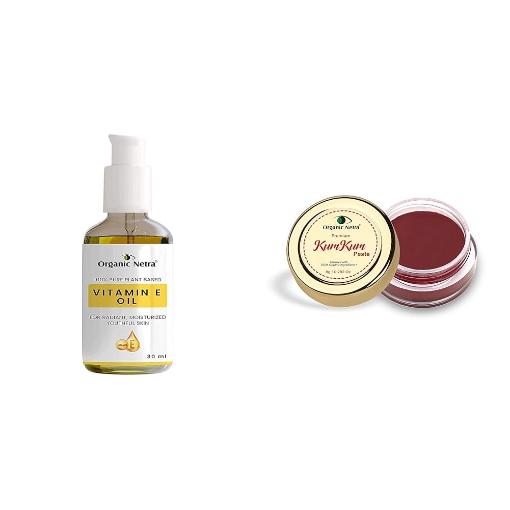 Organic Netra 100% Pure Plant Based Vitamin E Oil For RadiantMoisturized Youthful Skin For Men and Womens Reduces scarsstretch markswrinkles helps in hair growth -30 ml.Organic Netra Vitamin E oil is extracted from pure natural plants and seeds rich in Vitamin E. Natural vitamin E is known to absorb quickly and efficiently by the body than any other synthetic type. Easily absorbed by the skin without that sticky feeling! Our vitamin E is blended and derived from Almond Apricot Avocado Sunflower Wheat Germ Rosehip and Coconut Oils. This vitamin e oil for scars has several skincare benefits. It works as an anti-aging solution to visibly reduce fine lines wrinkles stretch marks and improves skin tone. This is an amazing anti-aging solution that keeps your skin supple and hydrated. Removes circles and dark spots around the eyes. Use it as a make-up remover as a facial toner or even as a body oil as it works its magic on your skin!Organic Netra Sindoor/Kumkum Paste | Waterproof Long lasting Smudge Proof Sindoor | Pure and Natural Deep Maroon Colour Long lasting | Enriched with Natural and Organic Ingredients -8gmCertain substances have been identified as things that can easily gather and retain energy. KumKum is a form of such energy. Applying KumKum on the forehead is a symbol of Indian culture and also of sacredness and auspiciousness. Tradition of wearing KumKum or Vermillion is said to have traveled through more than 5000 years of the Great Indian Culture. In ancient India KumKum was not made of synthetic dyes and chemicals instead it was made from herbs turmeric and lime which induced medicinal effects that promoted both the married life of the lady and health of herself. Also the location of applying is according to the alignment of âChakrasâ in human body. It reflects the piousness of a lady and that she is a symbol of strength power beauty and unity of a family. As Organic Netra KumKum Paste is blended with all organic and natural ingredients it gives nourishing effects to the divine energy of your body. It has active natural pigments which deliver intense color that does not fade for many hours and suitable for all skin types. Ingredients: Beeswax Vegetable Food Grade Colours Natural Fragrance Jojoba Oil Almond Oil Coconut Oil Turmeric Powde