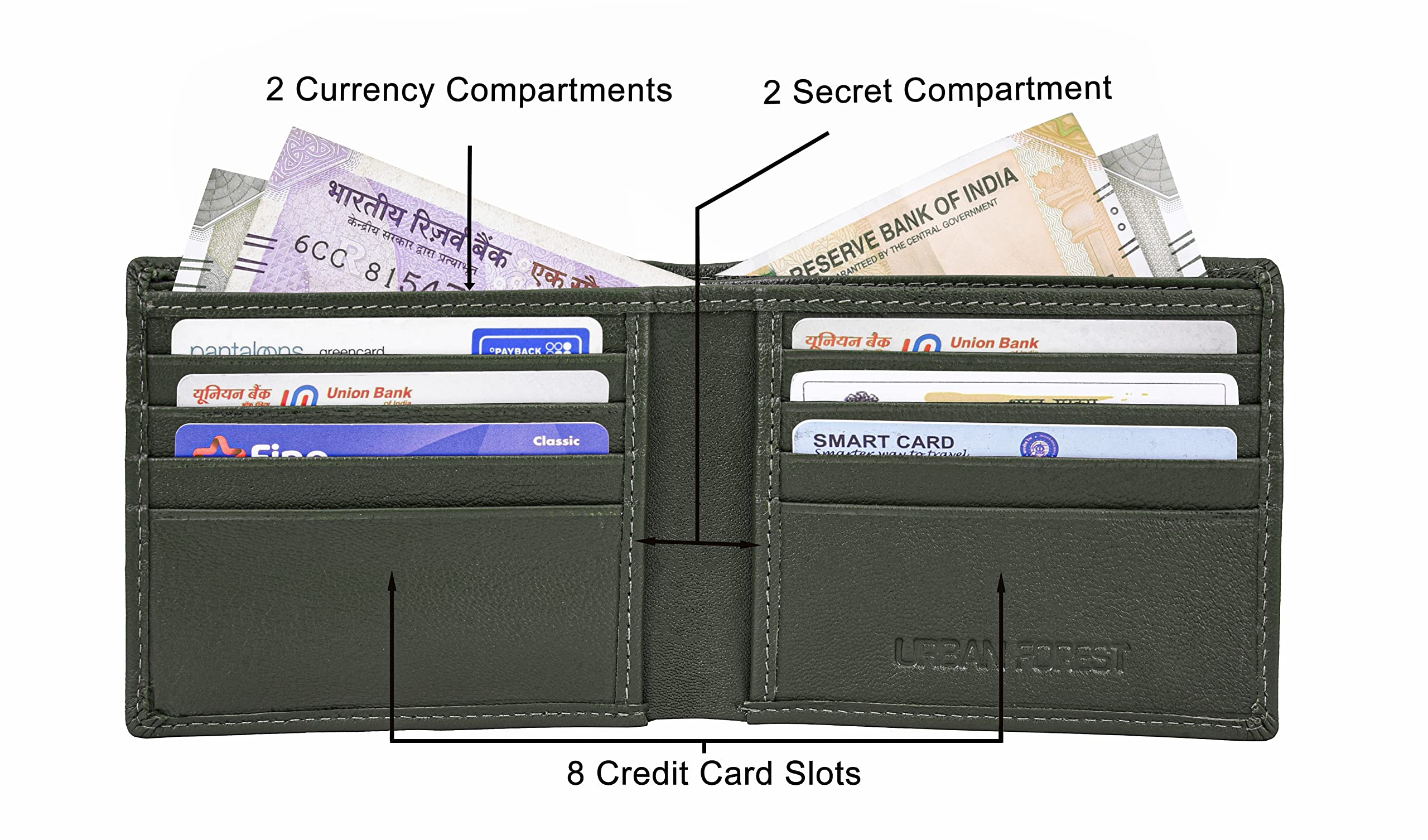 COMPARTMENTS - The wallet has 8 in-build card slots 2 currency slots & 2 secret compartment.