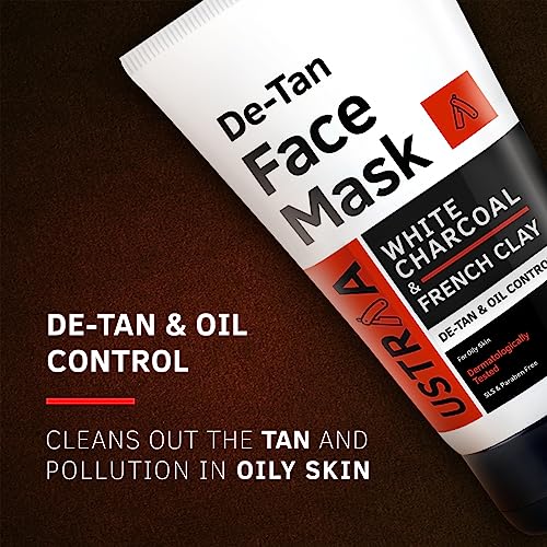 De-Tan Face Scrub - For men who spend a lot of time outdoor or sweat it out at the gym this is a must. While a face wash cleans your face the scrub penetrates into the pores of your skin and removes the dead skin. Making the skin healthier. Pollution stress lifestyle that involves eating a lot of junk food smoking or staying up late affects your facial skin health. This ultimately leads to pimples white-heads black heads uneven colour tone and dryness. The Ustraa face scrub helps repair your skin from all that and also de-tanning. With bigger walnut granule sizes it works more efficiently on a man's face as we men have thicker skin. Face Mask Oily Skin - This is a face mask designed to remove tanning and even out the skin tone. Skin that gets affected by prolonged sun exposure pollution and other irritants tends to gather impurities from the atmosphere which in the long run affects the skin and enhances aging. This mask helps to remove those impurities from the face and keep the face looking fairer younger and healthier. It also helps in excess oil removal. It is not a peel-off mask so it can be washed away with water only.