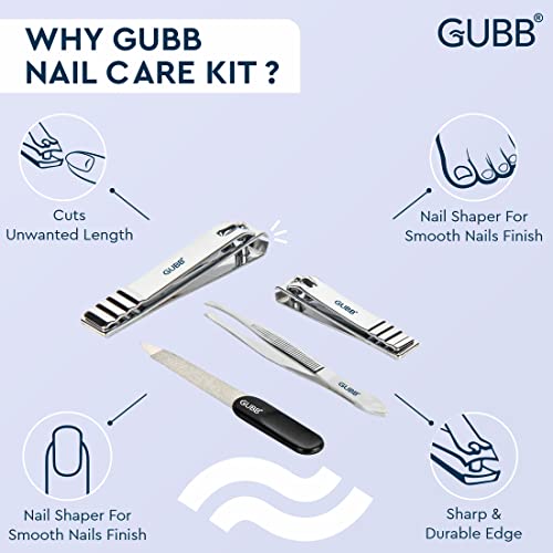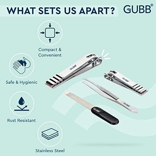 GUBB Nail Care Kit - Toe Nail Clipper, Finger Nail Cutter, Nail Filer & Flat Tweezer | Nail Clipper For Manicure, Nail Shaper for Smooth Nail Finish, Rust Resistant - Sharp & Durable Edge