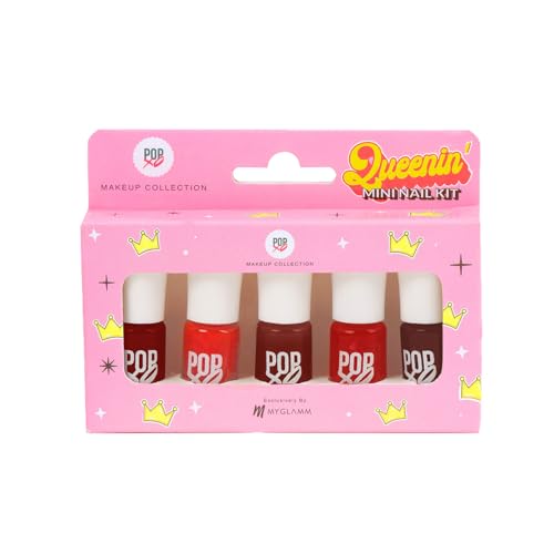 MyGlamm POPxo Makeup Collection Glossy Finish -Mini Nail Kit-Thrivin'-5X3mlThrivin' on self love. Thrivin' is a stunning set of 5 chip-resistant pastel nail polish toppers and bases will give your nails the #GlowUp of your dreams. Always having a set of freshly painted nails is every girl's ideal state of living. While frequent salon visits can be heavy on the pocket there is one fun trick that won't break the bank. Bring the priceless feeling of new nails home with POPxo Makeup Collection's Daydreamin' Mini Nail Kit. It includes 5 nail paint bases and toppers that will help you ace a salon-like manicure in the comfort of your own home. These nail polish bases and toppers have a chip resistant formula and offer a long-lasting wear. They have a high gloss finish and make your digits look oh-so-fab. So are you ready to be your own nail technician?MyGlamm POPxo Makeup Collection -Mini Nail Kit-Queenin' Glossy Finish-5X3ml"Confidence level: queenin' 24x7! Queenin' is a stunning set of 5 chip-resistant red nail polishes that are the perfect match for all your red hot and #spicy manicure moods. Let your sassy self run wild! Always having a set of freshly painted nails is every girl's ideal state of living. While frequent salon visits can be heavy on the pocket there is one fun trick that won't break the bank. Bring the priceless feeling of new nails home with popxo makeup collection's queenin' mini nail kit. This mini nail polish kit includes 5 nail paints in bold shades of red that are sure to make a statement wherever you go. These mini nail polishes have a chip resistant formula and offer a long-lasting wear. They have a high gloss finish and make your digits look oh-so-fab. So are you ready to be your own nail technician? "