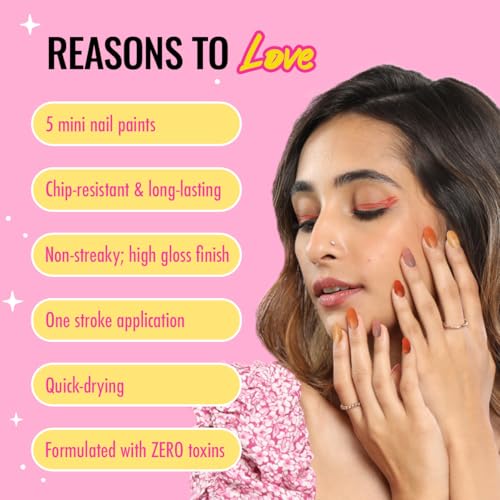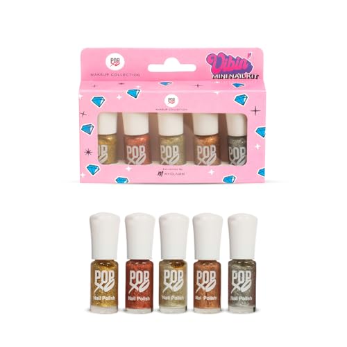 Good vibes only Vibin' is an #Extraa sparkly nail kit of 5 chip-resistant glitter nail polishes pack in some serious bling. Glossy glittery and OTT. Get ready to be obsessed! A set of freshly painted nails are every girl's ideal state of living. While frequent salon visits can be heavy on the pocket there is one fun trick that won't break the bank. Bring the priceless feeling of new nails home with POPxo Makeup Collection's Vibin Mini Nail Polish Set. It includes 5 mini nail polish in mesmerizing glitter shades. The thoughtful selection of glitter polishes in shades of gold silver champagne pink and bronze are all you ever need for a Glamm vibe. This mini nail polish collection is made with a chip resistant formula and offers a long-lasting wear. Its high gloss effect gives your at-home manicure a salon like shine. Are you ready to be your own nail technician?