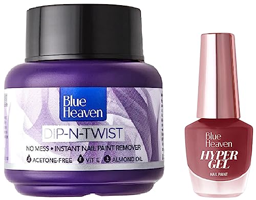 Blue Heaven Dip & Twist Nail Paint Remover 40 mlOne Second Nail Polish Remover with Nourishers & Conditioners Acetone Free. Blue Heaven Dip & Twist Nail Paint Remover.Blue Heaven Hypergel Nailpaint - Mauve Magic 301 11mlGet ready to fall in love with the 48 gorgeous colour shades of hypergel nail paints from Blue Heaven. The gel based premium formulation is chip resistant boasts of intense colour pay off and dries quickly. It glides smoothly on your nails and gives a flawless finish. Packaged smartly with the attractive golden cap these gel nail paints will truly bedazzle you.