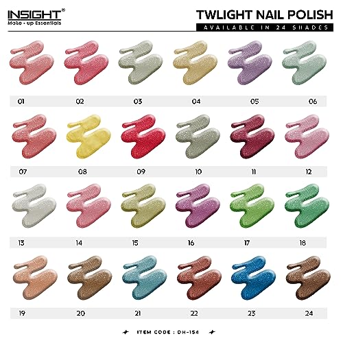 Insight Twilight Nail Polish Is Full Of Glitter And Sparkle It Is 3D Finish And Blinding On Nails. Available In 24 Colours You Can Use It Alone Or Mix & Match With Any Colours As Per The Occasion Such As Parties Or Dating.