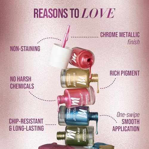This nail polish is long-lasting and is formulated without any harsh chemicals. Its one-swipe smooth application gives you rich colour pay-off in just two coats. These chip-resistant and non-staining nail polishes add the perfect splash of color to your usual OOTDs! MyGlamm Chromantic Metallic nail polish brings you rich color pay-off in 16 colorful shades. Try this nail makeup product and give your nails a colorful makeover!