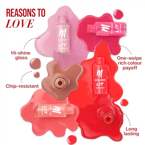 The glossy LIT Nail Enamels by MyGlamm promise super long-wear time guaranteeing endless nights of fun with your digitswhether its in real time or some good ol sexting. Nothing sets the mood quite like the smooth wet finish of glistening bright nails. Weve used a formula that improves colour reflection enhances brightness and brings out shinetime to put those nails to good use.