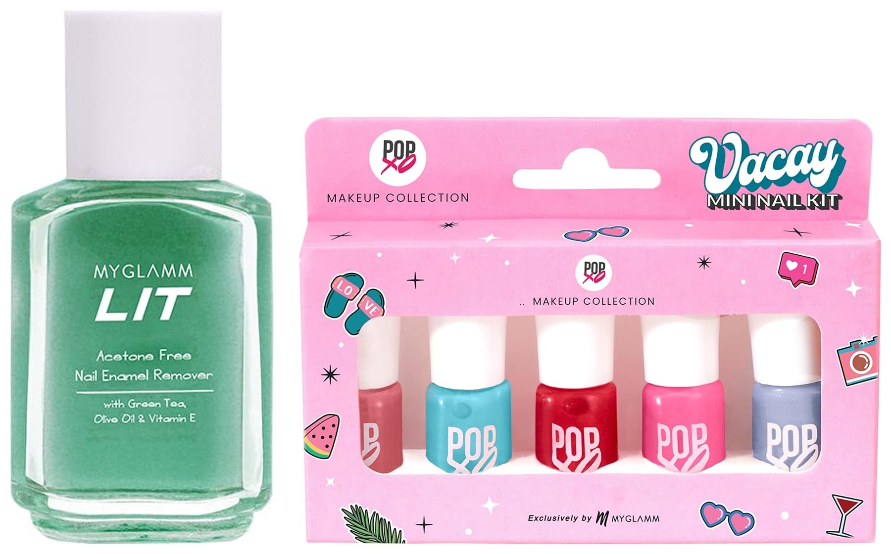 MyGlamm LIT Nail Enamel Remover 30 ml | Acetone-free Nail Polish Remover | Enriched with Green Tea Olive Oil & Vitamin ELIT NER is an acetone free hydrating formula which removes nail enamel in just 1 swipe. It contains Green tea extracts Olive oil and Vit E Cruelty-free Vegan Paraben-free Phthalate-free SLS-free Mineral oil-free Triclosan-free TEA-free Silicone-Free Gluten-free Contains Natural Extract Sulfate-Free Formaldehyde-Free Triclosan Free TEA-Free D5 FreeMyGlamm POPXO MINI NAIL KIT - VACAY-Bloody Mary Perfect Peach Beach Please Pink - nic Sea Ya -Paraben Free Long Lasting Formula valentine gift set 5 in 1 Combo(Pack of 5) - 15mlThe BFF your nails need! This classic set of 5 nail polishes contains all your fav go-to shades. When in doubt choose one (or more) of these stunners to ace that #AlwaysOn look. Oh and theyre chip-resistant too. A set of freshly painted nails is every girls happy place. While frequent salon visits can be heavy on the pocket there is one fun trick that won't break the bank. Bring the priceless feeling of new nails home with POPxo Makeup Collection's Bestie Mini Nail Polish Set. It includes 5 nail paints in bright shades of peach brown white black and red; perfect for painting your and your best friends nails. All nail colours in this mini nail polish kit are made with a chip-resistant formula and offer long-lasting wear. Its high gloss effect gives your at-home manicure a salon-like shine. Are yall ready to flaunt those gorgeous nails?