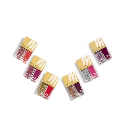 MyGlamm Two Of Your Kind Nail Enamel Duo - The Glitter Collection 12 gorgeous shades for the perfect glamm nails Carnival Crush: A splash of hot pink & silver glitter for a candy floss-filled night at the carnival. Bring The Bling: A splash of magenta pink & red-pink glitter for a night that calls for some champagne. Steal The Show: A splash of tomato red & a mix of glitter for a date night at the movies. High On Drama: A splash of blood-red & gold glitter to ânail' the retro karaoke night. Party Parade: A splash of berry purple & pink silver glitter that looks striking when wrapped around a glass of sangria. Wicked Wish: A splash of aubergine & copper glitter for an unforgettable girls' getaway.