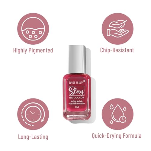 Achieve super glossy nails with Swiss Beauty Slay Nail Colour. The high-quality formula ensures a smooth application and long-lasting wear while the vibrant pigments deliver an exquisite glossy finish with every stroke. With 96 stunning spectrums of colours this collection gives you endless possibilities to up your nail game promising flawless nails in mere minutes. These long-lasting nail paints ensure a flawless chip-resistant finish that lasts. The quick-dry formula guarantees convenience making it ideal for on-the-go glamour. Whether it's vibrant or subtle these polishes cater to every mood and occasion offering both beauty enhancement and nail care.