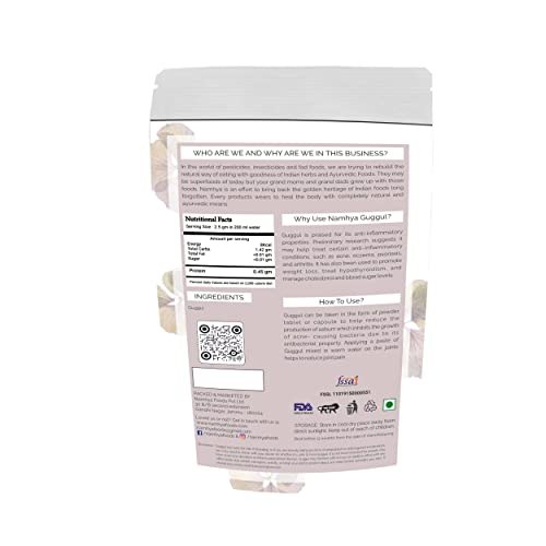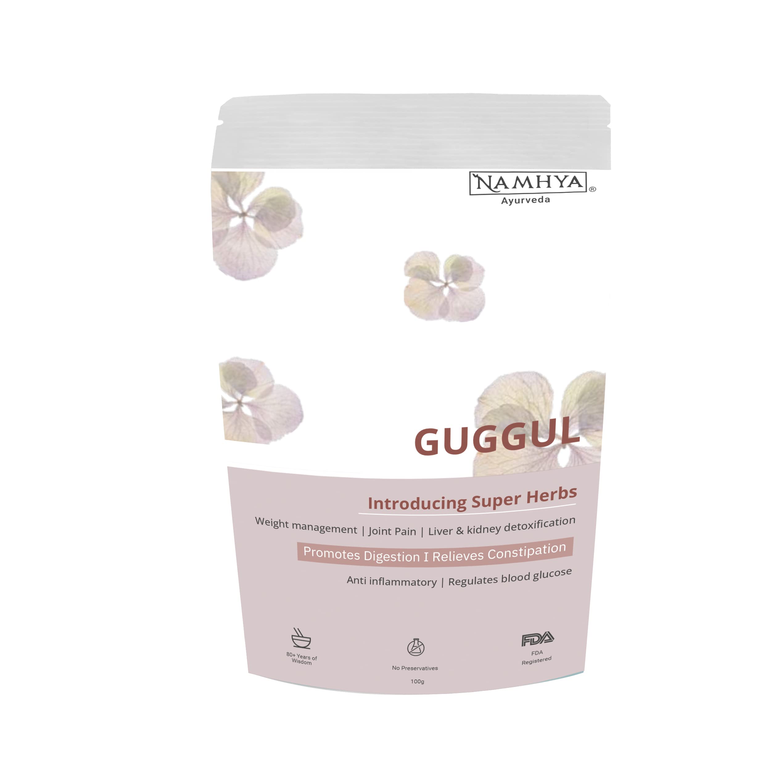 Namhya Guggal Powder is also known as guggul or medohar guggulu is a resin derived from the Commiphora wightii tree which is native to India. It has been used for centuries in traditional Ayurvedic for its various health benefits. Namhya Guggal Powder is a 100-gram pack of guggal powder. Guggal is believed to have anti-inflammatory antioxidant and analgesic properties. It is commonly used to support joint health and provide relief from pain and inflammation. Guggal is also known for its potential cholesterol-lowering effects and its ability to support thyroid function. It is available in powder form making it convenient for consumption and incorporation into various preparations.
