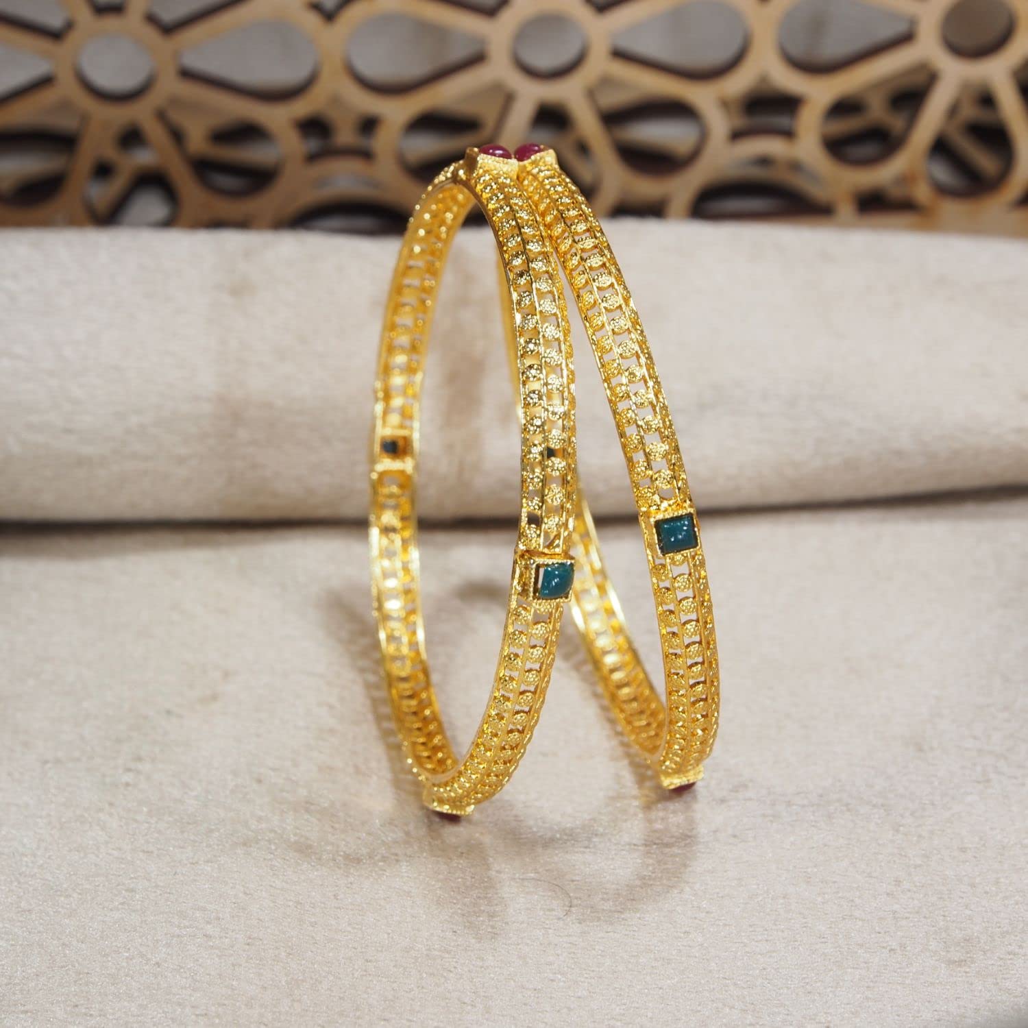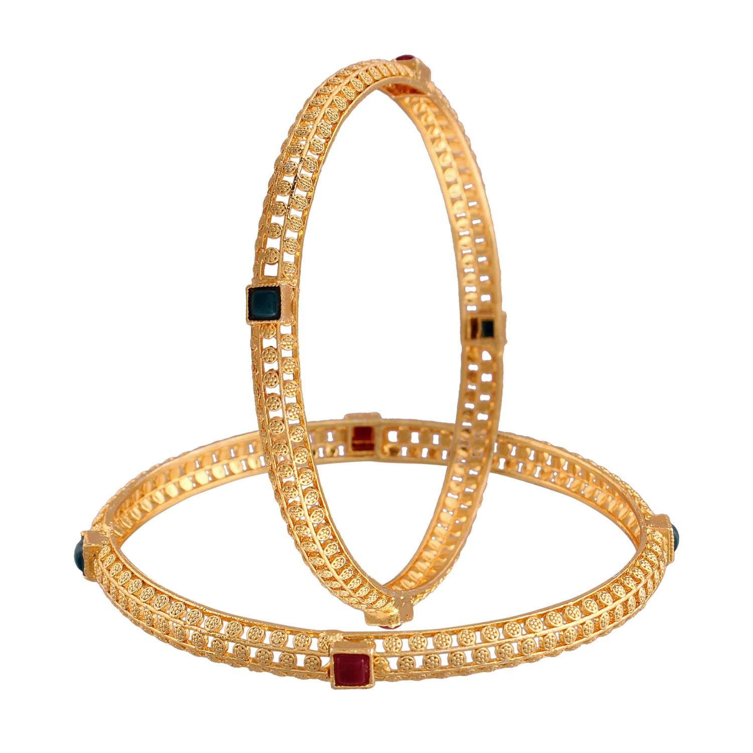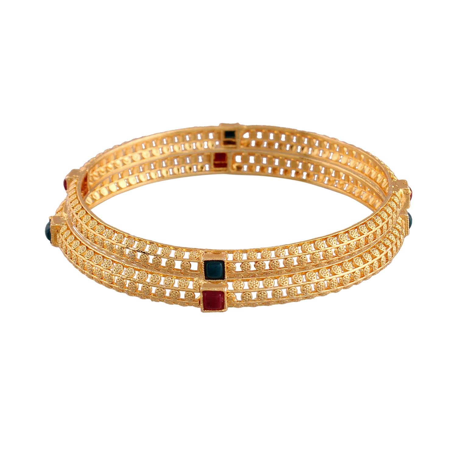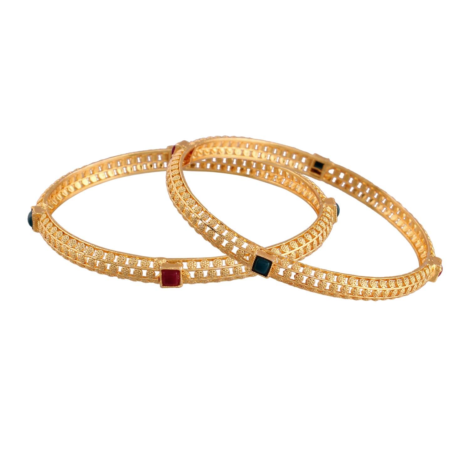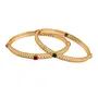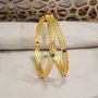This bangle set is intricately crafted in 18K gold plating. It's embellished with pearls. This captivating bangle set is a great gifting option and is a perfect pick to add to your jewelry collection. You can style it with ethnic or western clothing. (Pack of 1) SIZES: Available in 2.4 2.6 2.8.