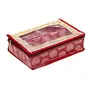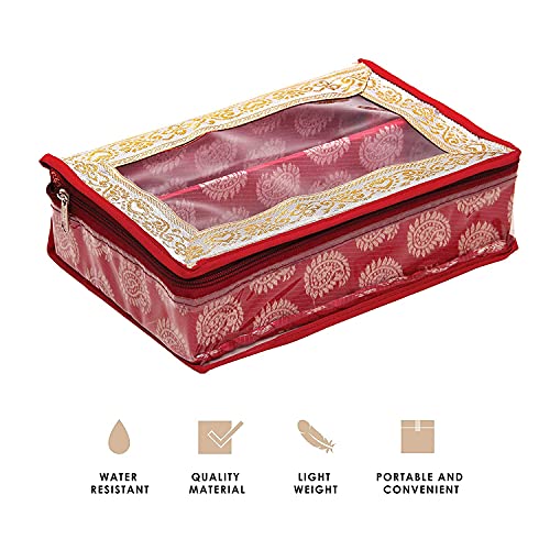 DESCRIPTION : Now organize your bangles systematically and protect them from breakage. The transparent pouch gives convenience of better visibility. You can use the vanity box in the drawer too 0and can use the pouch for storing your bangles and bracelets as well .The user can view the bangles from the transparent sheet above the bangle box without opening it. A supportive frame is installed on the boundaries of the transparent box which serves better safety of the bangles. FEATURES : Trendy look. Light weight. Fine finish. OTHER DETAILS : Tailored with transparent fabric. Standard quality with high finish stitches. Color- Maroon. Zip closure. Can store enough bangle. Best as indoor organizer and travel friendly. A perfect gift .
