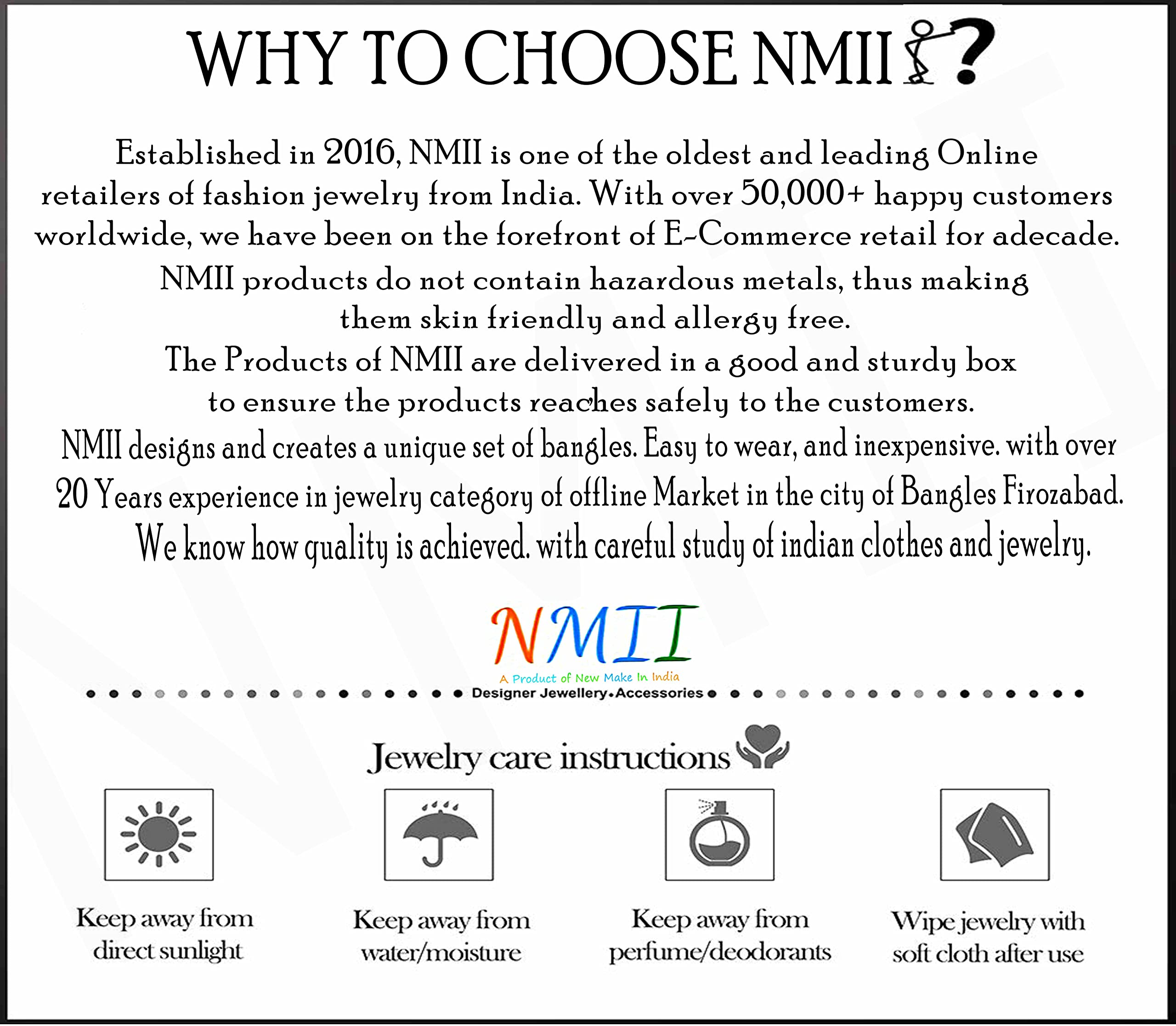 These Zircon Gemstone Studded worked Metal Bangle set can make your hands pretty and attractive. These Bangle set are from The Latest Collection of NMII (New Make In India) . It's Beautiful Glossy Finish Designer and Zircon Gemstone Glossy Bangle are made by good quality Plain and Zircon Gemstone Metal Material. These NMII (New Make In India) Stylish Trendy and Zircon Gemstone Studded worked and Plain Glossy Finished Set Complete Your Look On Any Occasions Like Festival Party Wedding and Engagement etc. Welcome To The NMII (New Make In India)The World of Glass Bangles Metal Bangles Acrylic Bangles Chuda Set Bridal chuda set Kaleere set and Kadaa set or Other Women Jewellery accesories. Shop here from a wide range of following types of Bangles Glass Bangles Metal Bangles Silk Thread Bangles Acrylic (Plastic) Bangles Zircon Bangles Beads Worked Bangles Kundan Worked Bangles Lac Material Bangles New Electric Light Chudaa etc. From NMII (New Make In India) On . NOTE : Use NMII (New Make In India) Size Chart For Better Understanding About Your Chuda Set Size. CLEANING INSTRUCTIONS : Clean It with Very Dry Soft and Smooth Cotton Cloth. SAFETY INSTRUCTIONS : Keep the Bangles/Kadaa away from Direct Water Perfume Deodrant Sunlight and Other Chemical Substances and Keep the Bangle in a zip lock air tight pouch. Thanks For Choosing Our Brand NMII (New Make In India). If You Love and Like our products. So Please share your valuable feedback and customer review for our best experience and Share our product`s link to your friends and family. If you are facing any kind of problem Please refer to our Product Description such as Size and Care Instructions. If your problem is not solved by Our Description So Please contact us. Contact details are given below (In Product Description Section). We have been start selling products on since 2016.