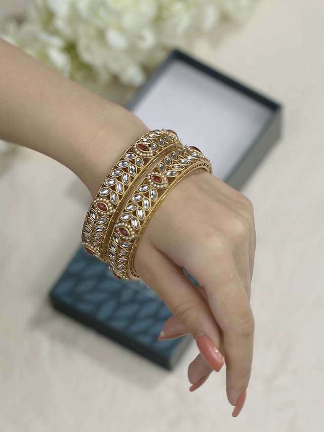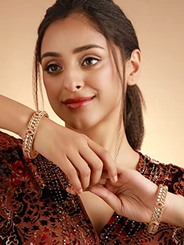 Styling: Dress up elegantly for your traditional event by styling your outfit with these studded gold-plated bangles by Priyaasi.