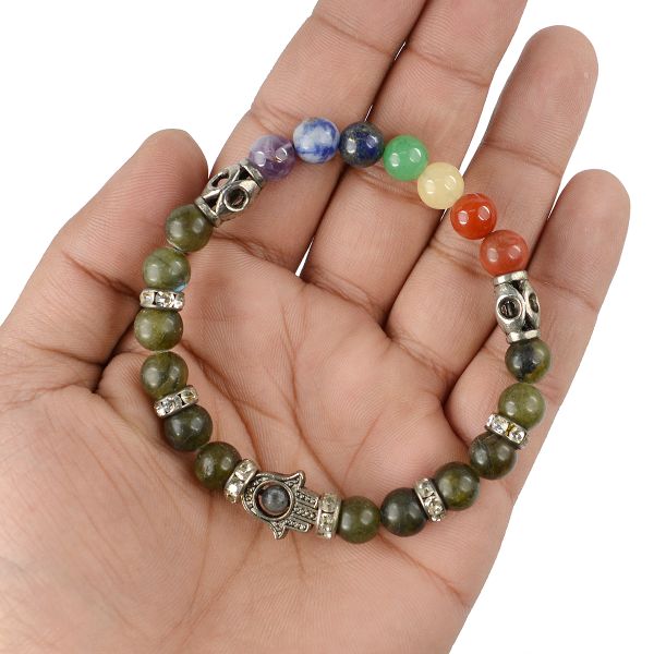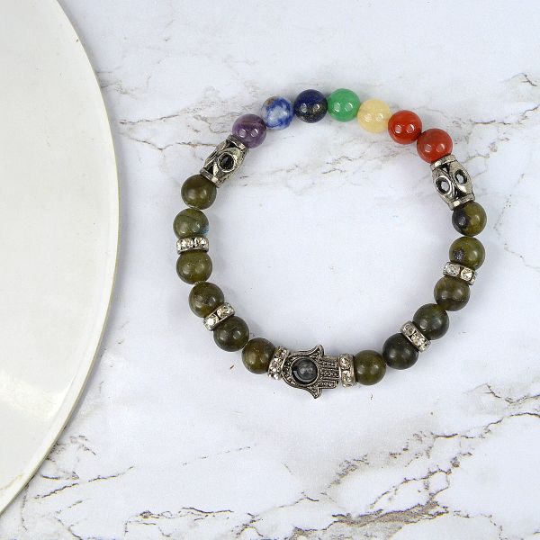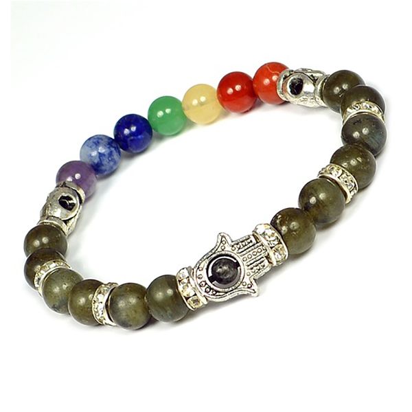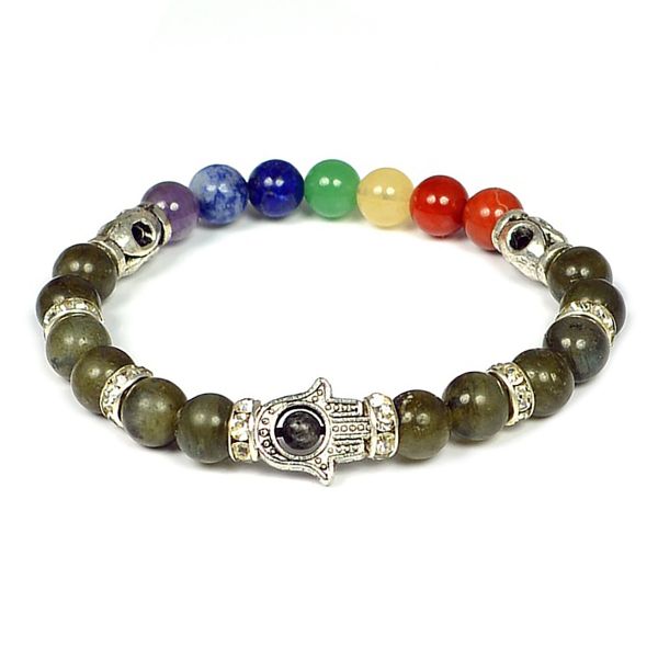 Reiki Crystal Products Natural Labradorite Bracelet with 7 Chakra Hamsa Charm 8mm Round Bead Bracele